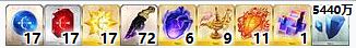 总计:弓之辉石*17、弓之魔石*17、弓之秘石*17、黑曜锐刃*72、蛮神心脏*6、封魔之灯*9、鬼炎鬼灯*11、传承结晶*1、量子*5440万
