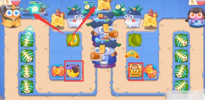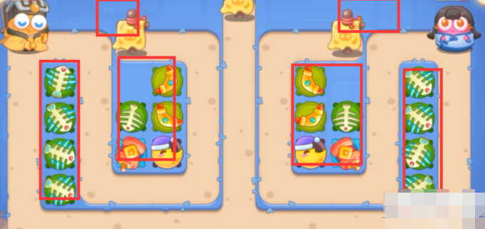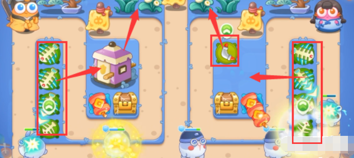 3、两侧道具清掉后,全部放满级鱼刺,卡中间打道具。开完后继续放鱼刺和回旋镖。