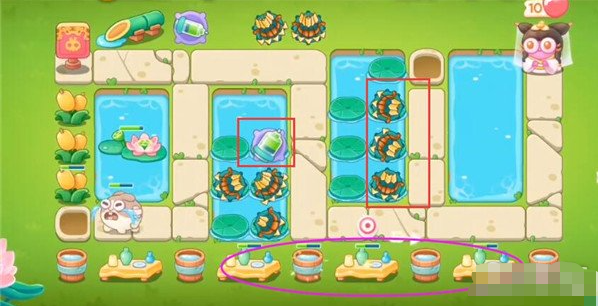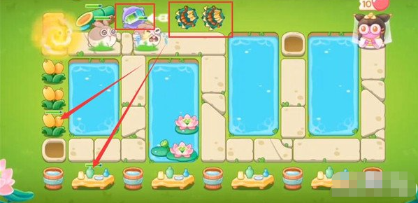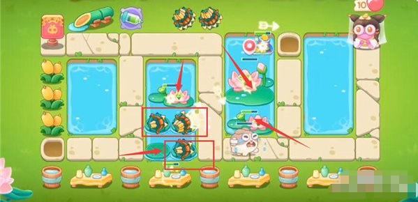 5、第9波在下面放一个鱼骨,障碍物全部清理,中间荷叶上面在放置多重箭,具体塔防如下。