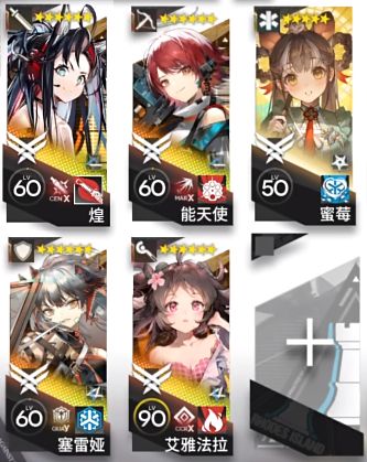 煌(精二60级)、塞雷娅(精二60级)、能天使(精二60级)、艾雅法拉(精二90级)、蜜莓(精二50级)