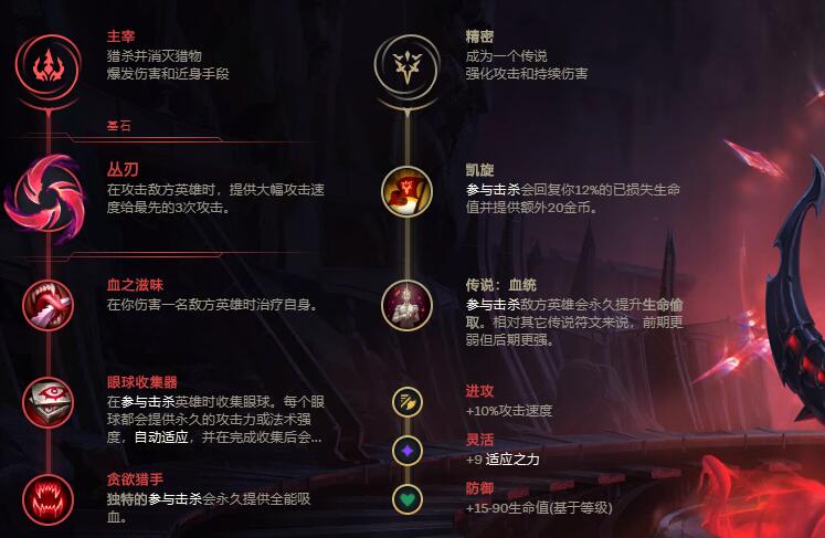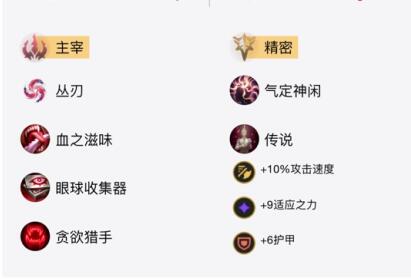 (1)主系符文:主宰+丛刃+血之滋味+眼球收集器+贪欲猎手;