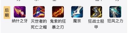 1、出装顺序:狂风之力+攻速鞋子+魔宗+贵所狂暴之刃+大帽子+纳什之牙