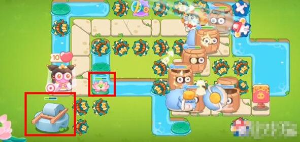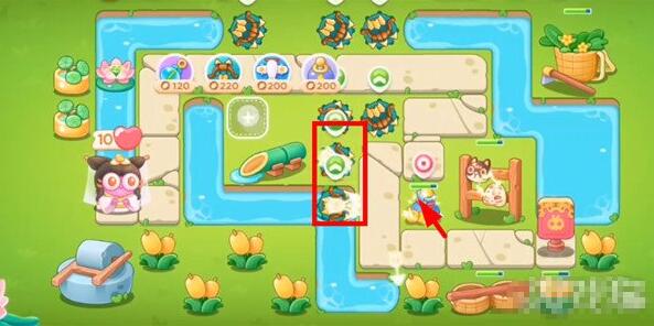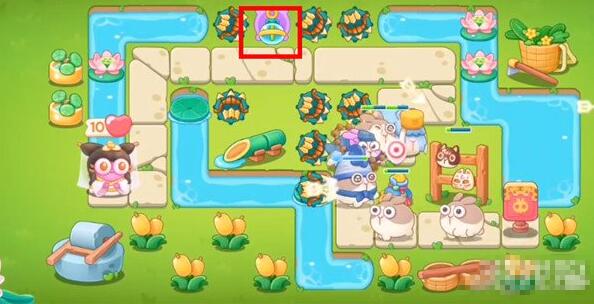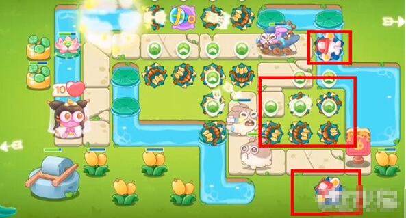 5、第四波时我们要小心滚滚兔,在如图所示位置建造泡泡塔,延缓兔兔速度。