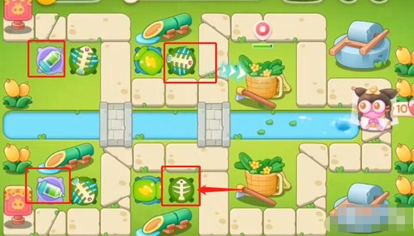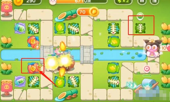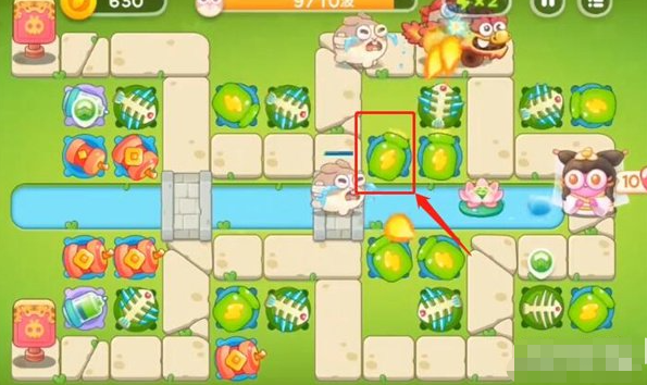 3、第二波左边两个毒针只升一级,中间两个鱼骨头,清理右边障碍物。