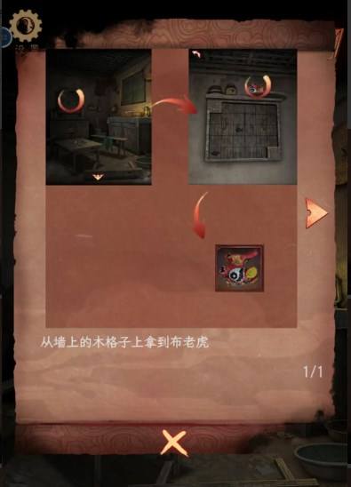 6、点击墙壁上照片对其使用红墨水让照片变得清晰,查看图片上的图案,点击柜子机关盒,再将图案位置调节一致,获得玩具灯。