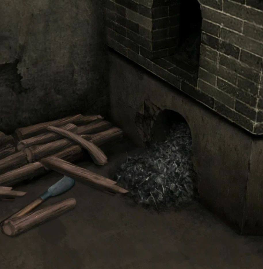 查看两个门中间的木机器,使用摇把后获得一些纸钱,查看右边的门,使用钥匙开门进入厨房,厨房左边脸盆旁边拿到一个水桶,右边炉子上拿到一壶开水,右边炉灶里面拿到烧火棍,炉灶左侧的木柴点一下发现可以挪开,优先挪开上面的就能看到下面的刀了,全部挪开拿到柴刀,恩,突然穿越到寒蝉的感觉。