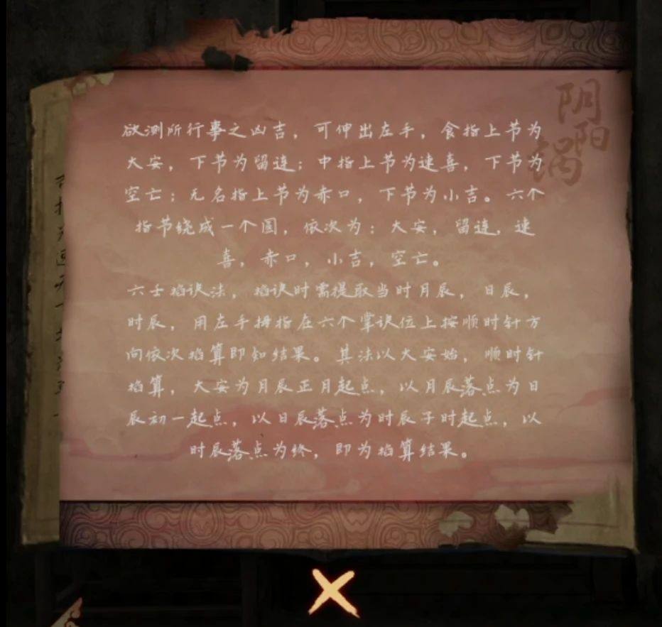 所以最终密码就是小吉、空亡、速喜、赤口、空亡,是不是感觉自己突然能去算一卦了?快克制一下回来继续解谜!调整密码打开左边的柜子拿到一对铜钹,右转给空茶壶加入茶叶和热水获得茶,给客厅中间的桌子上茶杯倒满就能打开卧室门了,右转进入卧室,床旁边拿到一双鞋子,别着急走床下还有个箱子,不过箱子上的密码暂时没有线索。