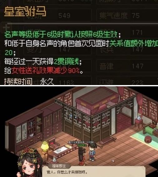 5、完成结缘后,主角可获得皇室驸马效果,同时可以随时在郡主的闺房里休息补状态。