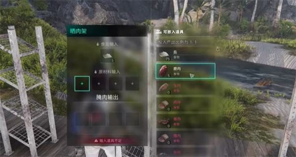2、接着需来到营地当中,然后需建造晒肉饼将肉类放入,放入后即可开始进行腌制;