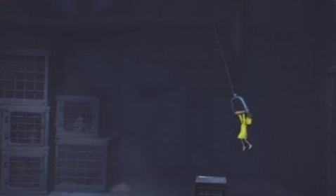 4、再将铁笼拖到绳子下面,爬到铁笼上荡到对侧。