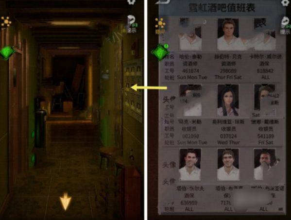 4、在酒吧走廊点击墙上的机关,根据上面的图案提示,结合收银机屏幕上的线索,调整正确的图案。