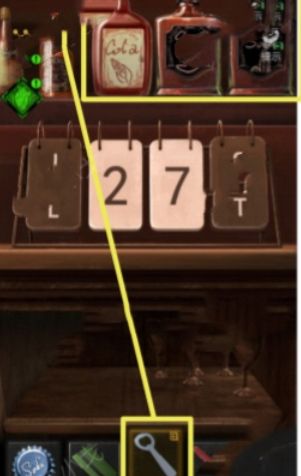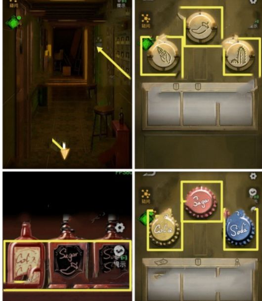 20、酒吧走廊点击墙上的机关,根据机关上的图案将蓝色:Soda、红色:Sugar、黄色-Cola,放上对应的瓶盖。