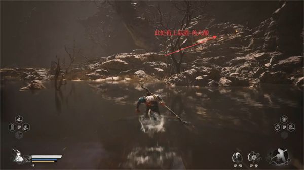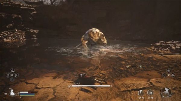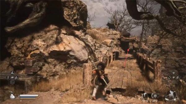 之后我们往佛龛(村口)旁边的木桥往下跳,沿着下坡走,可以看到一个小山洞,这里面有关键npc戌狗(能帮我们炼丹药,丹药能给予玩家防御力上升、气力上升或者攻击力上升。