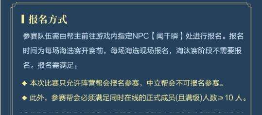 3、本次的报名只允许阵营帮会参与,中立帮会无法参与报名。