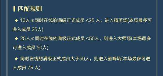 25人≤同时在线的满级正式成员<50人,则进入大师场(本场最多可进入成员 50人)