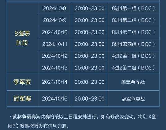 剑网3会定期开启武林争霸赛,那么第五届武林争霸赛什么时候开呢,第五届《剑网3》武林争霸赛的练习赛将在8月22日开启、海选赛:9月10日开启,以下就是详细的第五届武林争霸赛开始时间。