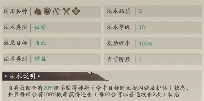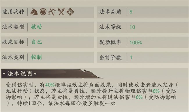 作为队伍中的全能辅助,固有被动法术“九曲葬花”可以提升主将的物理伤害,同时保障主将不受负面影响,为敌方施加控制,保障队伍的稳定出伤能力,配合法术“纵横捭搁”提升自身防御的同时代替友军成为攻击目标,保障双C状态的同时稳定触发固有法术。剩下的法术推荐选择“岿然不动”可以在战斗前2回合附加敌军群体畏怯(无法进行普通攻击)状态,第3回合恢复兵力最低单体血量,进一步保障输出环境。