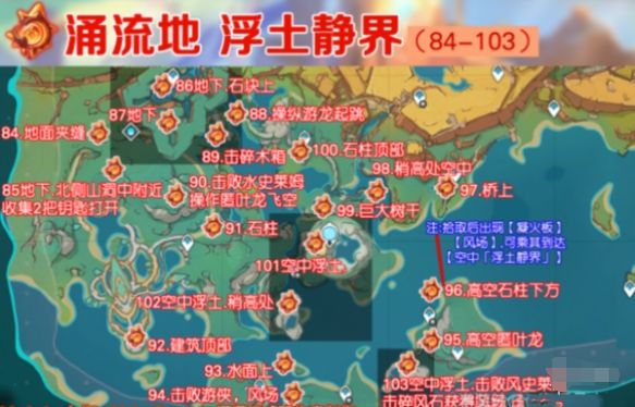 6、涌流地-浮土静界:该区域共计有20个火神瞳,大部分分布在地图北侧。