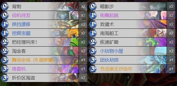 在这一构筑中,新加入的“摄影师”可以有效防止“法术迸发”将增益效果错误地传递给船工,避免无法回手的尴尬局面。卡组的灵活性得到了增强,“礼物”替换掉了“背刺”,让你在对局中能够更随意地应对各种情况。新加入的“街舞起跳”也提供了更多的斩杀机会,或帮助你在关键时刻回手南海船工。
