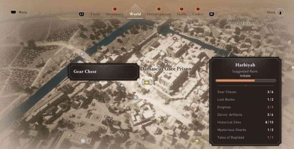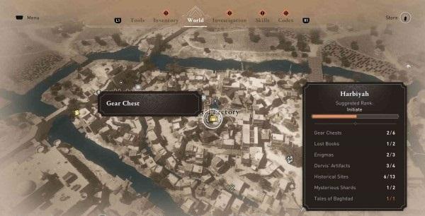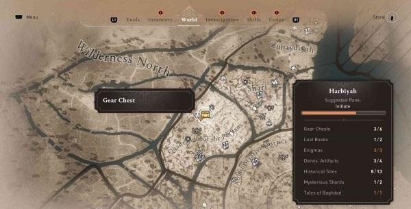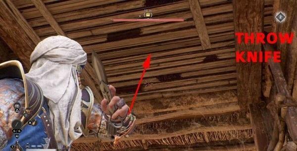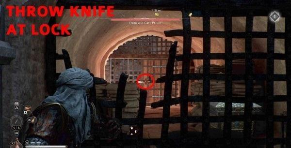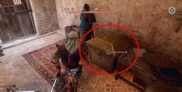 此装备箱在下层一个上锁的房间裏,通往箱子所在房间的门在东侧,门是锁着的,需要用飞刀打碎门锁。从箱子西侧走穿过门洞,用飞刀击中门背后的锁即可。