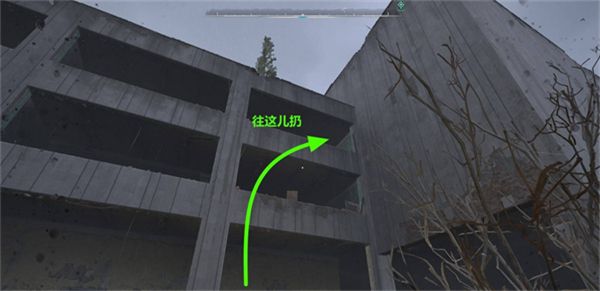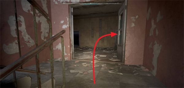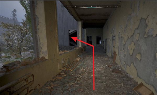 6、炸开门后,从建筑物的右侧进入,找到直角楼梯并走上去,穿过外侧的走廊。