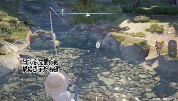 对准水面,右键挥竿,将鱼钩抛入水中。