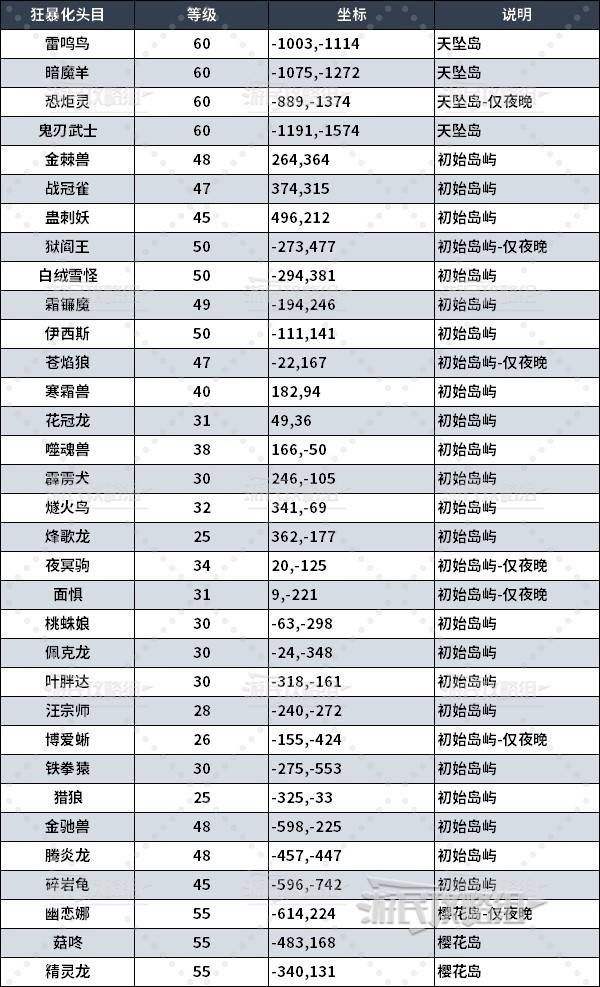 天坠之地版本更新后,在本体岛屿和天坠岛上都会出现狂暴化头目,位置请参考下图,分两张图展示。