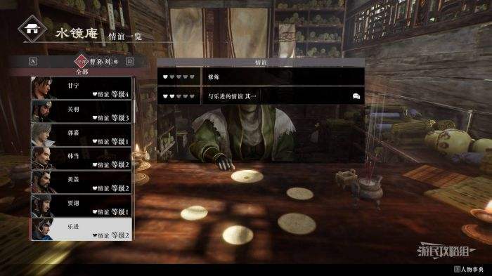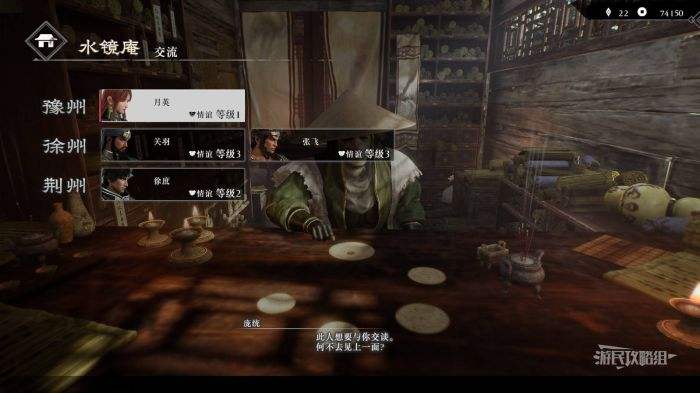 在水镜庵能够兑换古钱币、查看当前与各武将的情谊,并且查看当前可以交流的武将及位置。