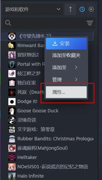 2、右键点击游戏,选择 “属性”。