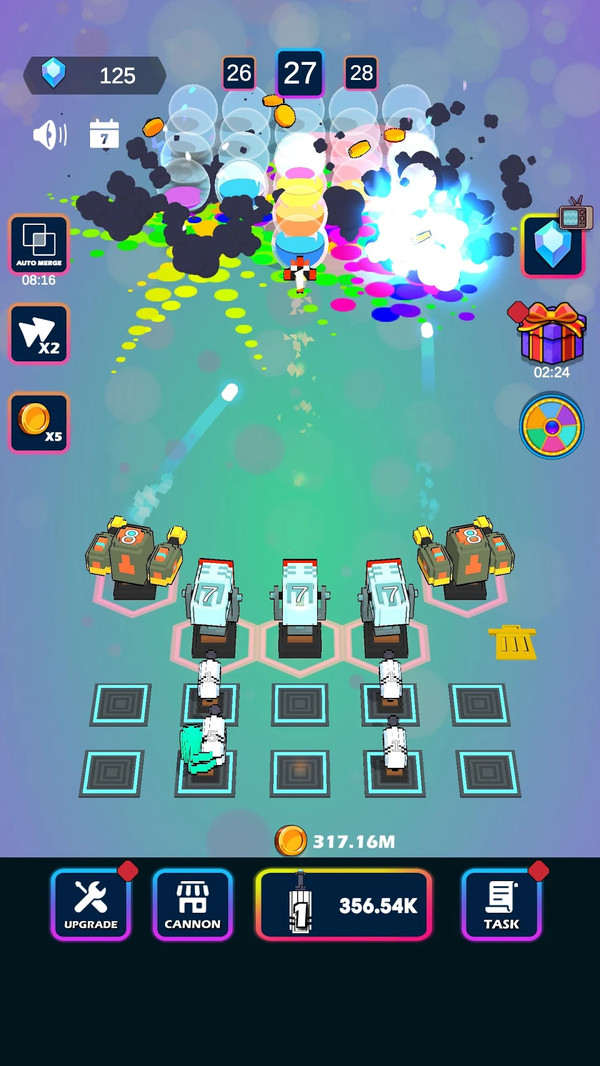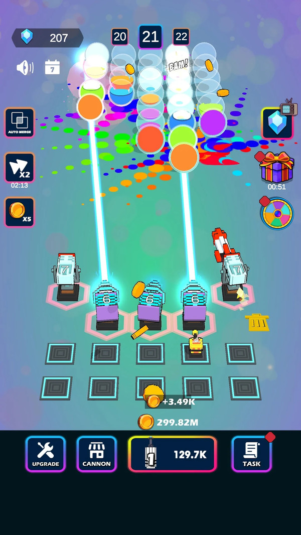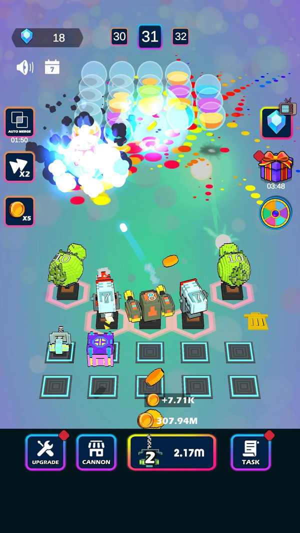 3、有趣的放置塔防游戏,在您的武器库中解锁不同的大炮,以最佳时机和技能合并和升级大炮。