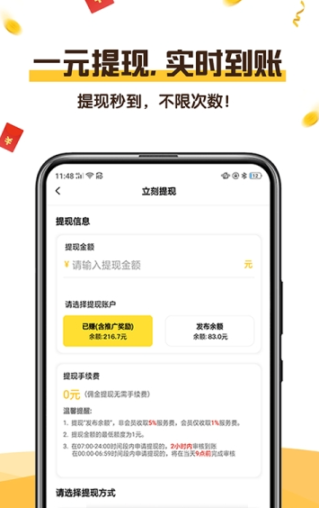 1、一元提现,实时到账,提现秒到,不限次数。