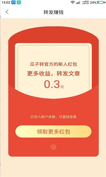 瓜子转app是一款非常棒的手机转发阅读赚钱软件,在这款软件里有着非常多的任务,大家可以选择各种赚钱模式,还有发圈赚钱服务哦,操作全部非常的简单,喜欢这款软件的小伙伴们不要错过哦,快来点击下载安装吧。