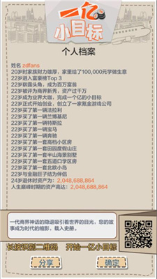 一亿小目标破解版是一款趣味十足的模拟经营游戏,玩家在游戏里可以体验不一样的人生,主人公定了一个小目标,先挣他一个亿,白手起家到身价过亿,中间的创业道路如何坎坷刺激,抓住每一个财富的风口,利用自己的商业天赋,轻松玩转财富。