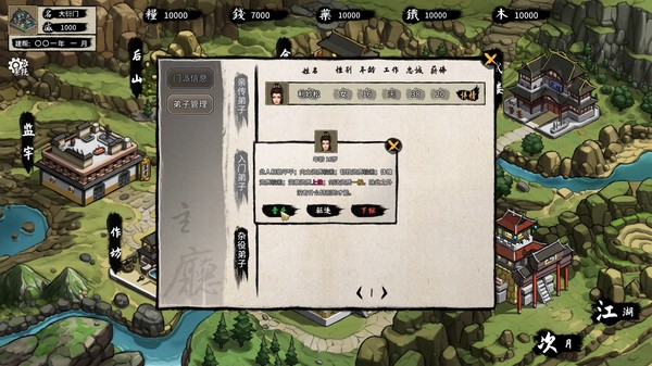门派要生存自然少不了要招募弟子,招募的手段各式各样,可以通过门派发布消息,也可以派遣弟子到江湖四处寻找,甚至去掳掠关入监牢,强迫其加入;而且据说江湖上还有不少“人贩子”,有钱的话,说不定能买到资质不错的人哟。