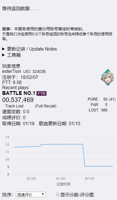 11、ptt趋势图,注意:这个趋势图并不是官方的数据,而是查分器记录了你的数据后展现出来的