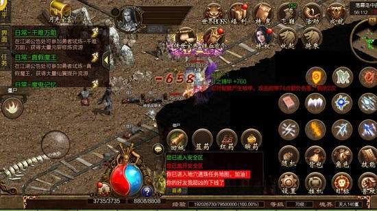 后来发现主线任务之外,还有日常成就任务可做,有五次机会,点进去接受任务,就会免费传送到矿洞,里面有半兽人、山洞蝙蝠、触龙神这些等级高经验值多的精怪,消灭精怪就能副本通关,回到比奇城就能看到等级提升了,还有宝箱一个。