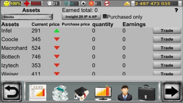 这款游戏里面,你扮演一个资产投资公司的老板,公司业绩有盈有亏,你需要想办法充分发挥你的才能,增加公司收益,建立一个强大的商业帝国,对这款游戏感兴趣的朋友快快来下载挑战吧!