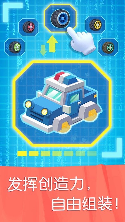 自由搭配轮胎、贴纸等汽车配件,发挥创造力,组装警车、压路机、装载车等24款车型吧,然后开着新汽车环游城市!多种富有挑战性的上下坡地形出现,一路飞车,注意安全!(儿童创意DIY,体验驾驶的乐趣)