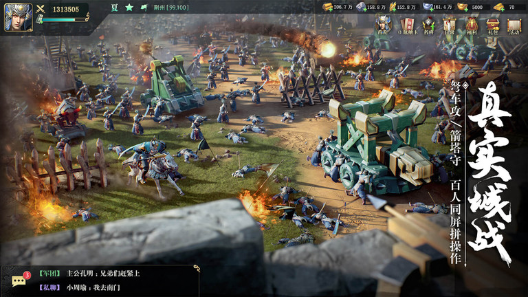 不是挂机,真讲操作!真实区域城战,调度军队及器械、制定攻守路线,佯攻东城门、集火西城门,火牛压制敌方强队,投石车拆城门,更有实时语音系统,百人同屏战个痛快!