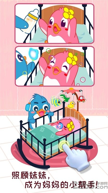 二胎时代,最担心的也许是两个孩子的相处。游戏中让孩子角色扮演企鹅小福,做妈妈的小帮手,帮忙照顾妹妹,冲奶粉、摇摇篮等,感受照顾小宝宝的乐趣,树立起责任感。