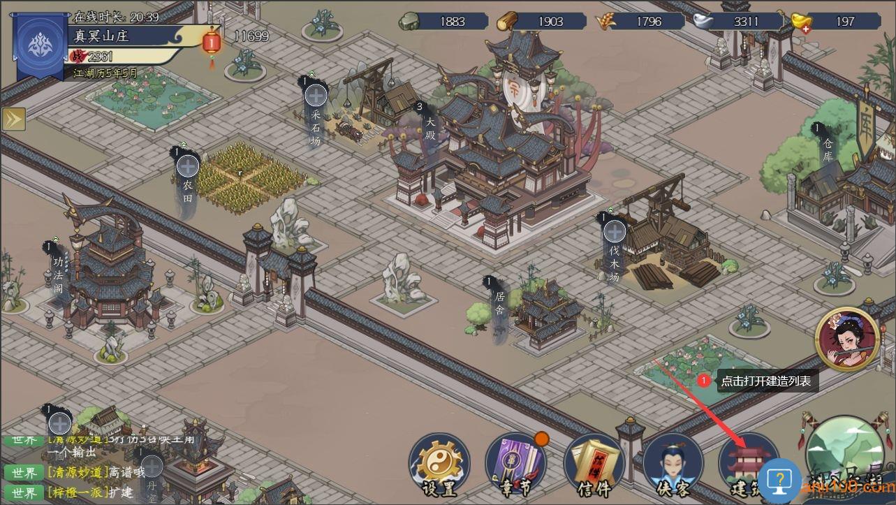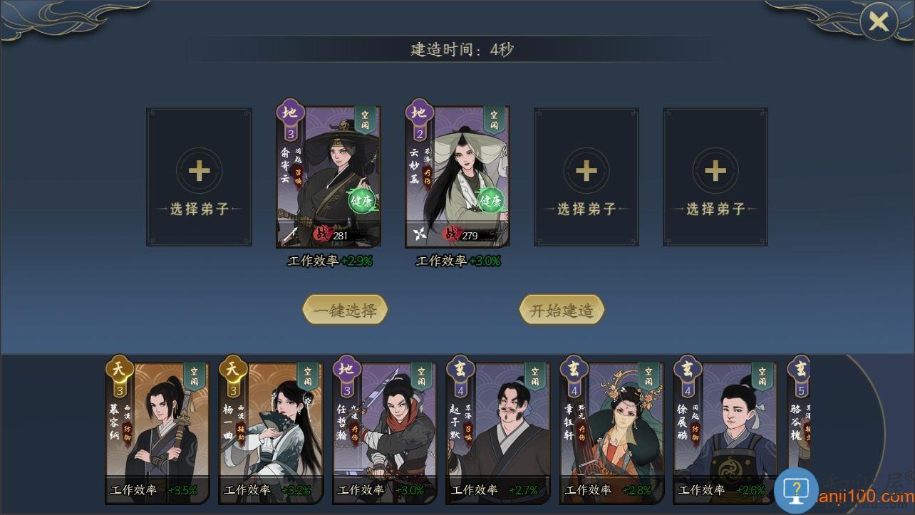 首先,需要建造建筑物,在宗门内的基础建筑都在建筑界面有所展示,掌门可根据章节任务指示与需要进行建造。点击需要建造的建筑,然后拖动建筑物至空地,点击“对勾”,选择参与建造的弟子,或点击一键选择,随后点击开始建造即可。