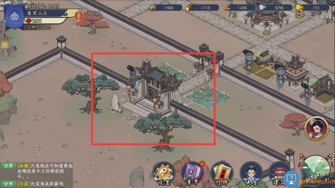 如若需要派遣弟子进行游历,需要于山门处将弟子组成编队才可以哦。山门的位置位于宗门大殿正前方,如若寻找有些困难,可以对照图中位置进行寻找哦。点击山门,选择编队,将需要派遣的侠客拖动至队伍内,选择保存即可。