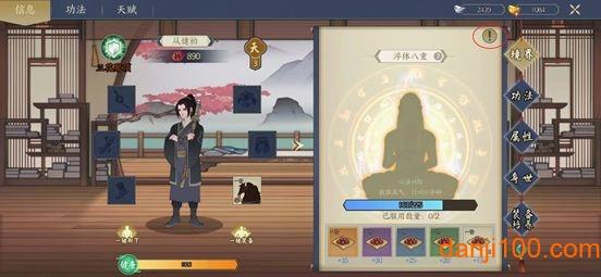 (2)在该界面内,可装备功法,查看属性,身世并对装备进行培养,详细功能介绍诸位掌门可以通过界面中的感叹号进行查看。