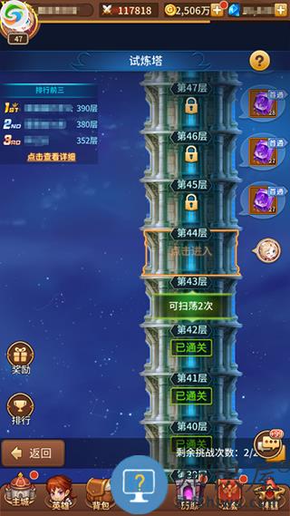 每天有2次免费挑战次数,挑战可获大量英雄经验,挑战的难度越高,经验越多