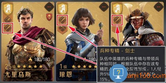 英雄确定完毕,我们对其配备对应的士兵,例如图所示的组合,只有上阵剑士才能把战斗力最大化。在副队的选择上,有能力的情况下可以参照主队的规则再配一队,如若资源有限,我们暂时可以拿到什么就上什么,等后期获取更多英雄后再考虑阵容问题。