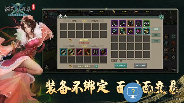 所有掉落的装备不绑定,玩家可一对一交易,亦可摆摊交易,获取银票。帮会抢首领赢道具,拍卖道具均分金币。