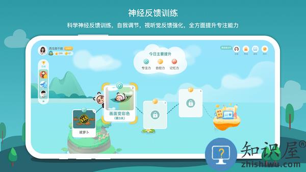 主要面向5-12岁儿童,配合可穿戴脑电检测设备,以神经反馈训练为基础,结合认知行为训练,提升大脑能力、培养注意力。APP每日推送个性化定制的训练内容,经过坚持训练可以有效改善大脑底层注意力水平和核心执行功能。