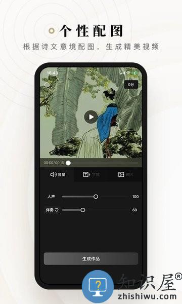 【一键生成】录音完成后,可一键生成带有配图配乐的视频作品。图片、背景音乐可自由切换选择。
