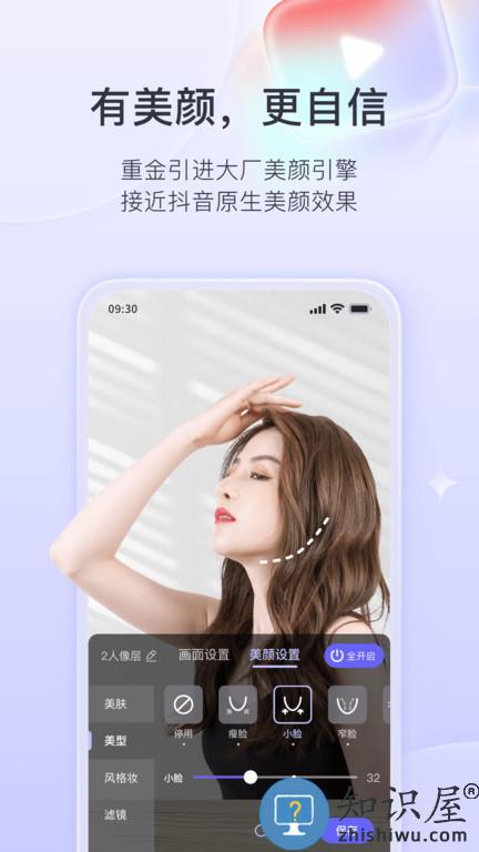 数十款美颜滤镜,支持脸型、肌肤、鼻、眼等多个部位的细致美化调整。