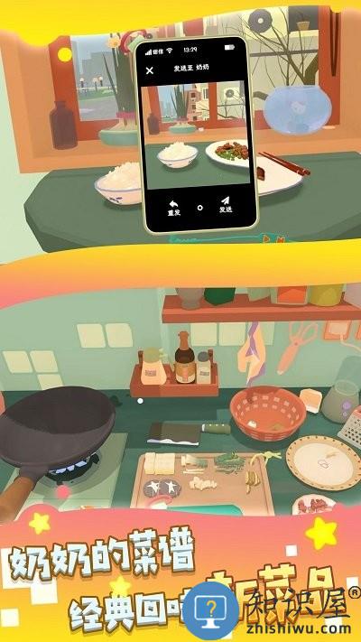 2、玩家在灶台和冰箱间移动,根据冰箱里提供的食材,按照奶奶通过手机远程教授的步骤做菜并拍照给奶奶评分。